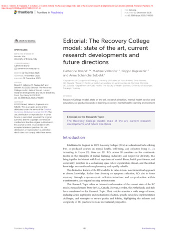 Briand, C., Vallarino, M., Rapisarda, F. et Selbekk, A. S. (2025). Editorial: the Recovery College model: state of the art, current research developments and future directions. Frontiers in Psychiatry, 16 . ISSN 1664-0640 DOI 10.3389/fpsyt.2025.1745050
