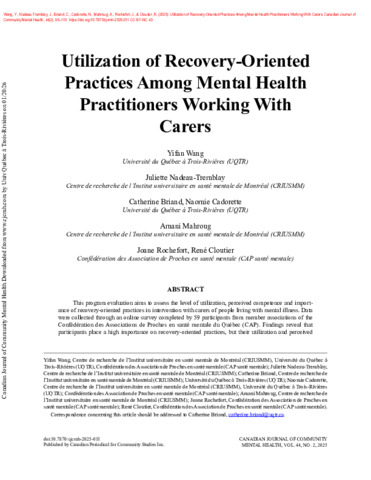 Wang, Y., Nadeau-Tremblay, J., Briand, C., Cadorette, N., Mahroug, A., Rochefort, J. et Cloutier, R. (2025). Utilization of recovery-oriented practices among mental health practitioners working with carers. Canadian Journal of Community Mental Health, 44 (2). pp. 95-110. ISSN 1929-7084 DOI 10.7870/cjcmh-2025-011