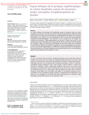 Drolet, M.-J., Lord, M.-M. et Lavigne, C. (2025). Enjeux éthiques de la pratique ergothérapique en centre hospitalier auprès de personnes aînées: perception d’ergothérapeutes du Québec. Canadian Journal on Aging / La Revue canadienne du vieillissement (2025/1). ISSN 0714-9808 DOI 10.1017/S0714980825100329