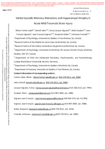 Fortier-Lebel, O., Jobin, B., Lécuyer-Giguère, F., Gaubert, M., Giguère, J. F., Gagnon, J. F., Boller, B. et Frasnelli, J. (2021). Verbal episodic memory alterations and hippocampal atrophy in acute mild traumatic brain injury. Journal of Neurotrauma, 38 (11). pp. 1506-1514. ISSN 0897-7151 1557-9042 DOI 10.1089/neu.2020.7475