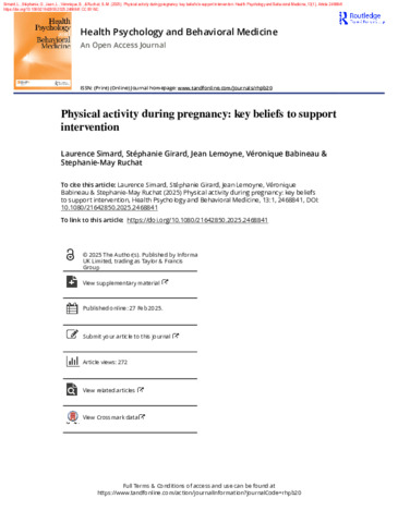 Simard, Laurence, Girard, S., Lemoyne, J., Babineau, V. et Ruchat, S.-M. (2025). Physical activity during pregnancy: Key beliefs to support intervention. Health Psychology and Behavioral Medicine, 13 (1). Article 2468841. ISSN 2164-2850 DOI 10.1080/21642850.2025.2468841