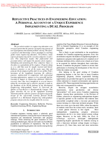 Cormier, L., Gaudreau, M.-A., Roy, J.-S. et Goyette, M. (2025). Reflective practices in engineering education: A personal account of a unique experience implementing a dual program. Dans Proceedings of the Canadian Engineering Education Association (CEEA) DOI 10.24908/pceea.2025.19559.