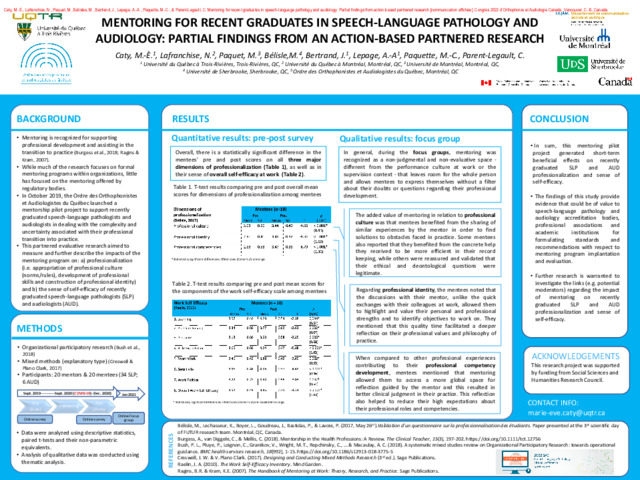 Caty, M.-È., Lafranchise, N., Paquet, M., Bélisles, M., Bertrand, J., Lepage, A.-A., Paquette, M.-C. et Parent-Legault, C. . Mentoring for recent graduates in speech-language pathology and audiology : Partial findings from an action-based partneres research. Dans NON SPÉCIFIÉ.