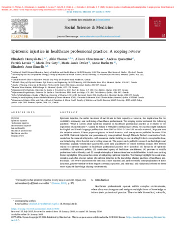 Hornyak-Bell, E., Thomas, A., Chrestensen, A., Quaiattini, A., Lavoie, P., Caty, M.-È., Drolet, M.-J., Rochette, A. et Kinsella, E. A. (2026). Epistemic injustice in healthcare professional practice: A scoping review. Social Science & Medicine, 394 . Article 119040. ISSN 0277-9536 1873-5347 DOI 10.1016/j.socscimed.2026.119040