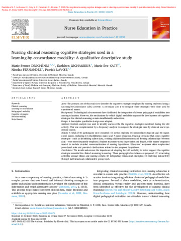 Deschênes, M.-F., Lechasseur, K., Caty, M.-È., Fernandez, N. et Lavoie, P. (2026). Nursing clinical reasoning cognitive strategies used in a learning-by-concordance modality: A qualitative descriptive study. Nurse Education in Practice, 91 . Article 104676. ISSN 1471-5953 DOI 10.1016/j.nepr.2025.104676