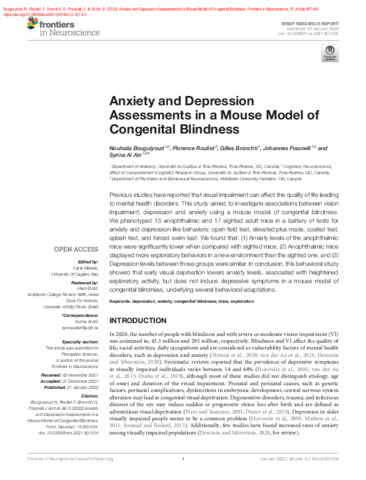 Bouguiyoud, N., Roullet, F., Bronchti, G., Frasnelli, J. et Al Aïn, S. (2022). Anxiety and depression assessments in a mouse model of congenital blindness. Frontiers in Neuroscience, 15 . Article 807434. ISSN 1662-4548 DOI 10.3389/fnins.2021.807434