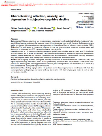 Fortier-Lebel, O., Hudon, É., Brosse, S., Boller, B. et Frasnelli, J. (2025). Characterizing olfaction, anxiety, and depression in subjective cognitive decline. Journal of Alzheimer’s Disease . Article 13872877251363422. ISSN 1387-2877 1875-8908 DOI 10.1177/13872877251363