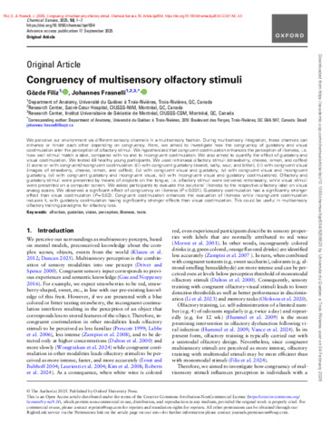 Filiz, G. et Frasnelli, J. (2025). Congruency of multisensory olfactory stimuli. Chemical Senses, 50 . Article bjaf034. ISSN 0379-864X 1464-3553 DOI 10.1093/chemse/bjaf034
