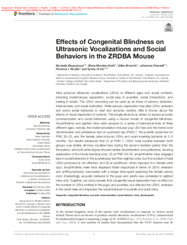 Bouguiyoud, N., Morales-Grahl, E., Bronchti, G., Frasnelli, J., Roullet, F. I. et Al Aïn, S. (2022). Effects of congenital blindness on ultrasonic vocalizations and social behaviors in the ZRDBA Mouse. Frontiers in Behavioral Neuroscience, 16 . Article 884688. ISSN 1662-5153 DOI 10.3389/fnbeh.2022.884688