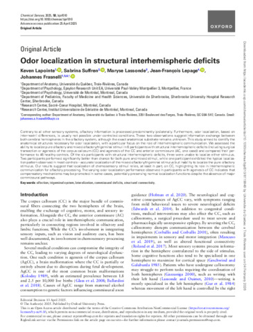 Lapointe, K., Suffren, S., Lassonde, M., Lepage, J. F. et Frasnelli, J. (2025). Odor localization in structural interhemispheric deficits. Chemical Senses, 50 . Article bjaf010. ISSN 0379-864X 1464-3553 DOI 10.1093/chemse/bjaf010