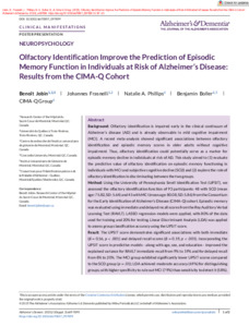 Jobin, B., Frasnelli, J., Phillips, N. A. et Boller, B. (2025). Olfactory identification improve the prediction of episodic memory function in individuals at risk of alzheimer's disease: Results from the CIMA-Q cohort. Alzheimer's & Dementia, 21 (S3). e097899. ISSN 1552-5260 1552-5279 DOI 10.1002/alz70857_097899