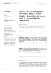 Brosse, S., Tremblay, C., Mérida, I. et Frasnelli, J. (2024). Specific structural changes in Parkinson’s disease-related olfactory dysfunction compared to others forms of olfactory dysfunction. Frontiers in Neural Circuits, 18 . Article 1503841. ISSN 1662-5110 DOI 10.3389/fncir.2024.1503841