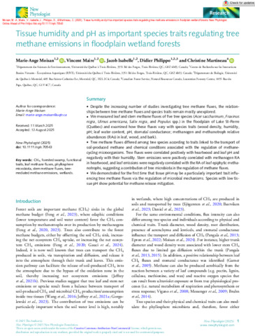 Moisan, M.-A., Maire, V., Isabelle, J., Philippo, D. et Martineau, C. (2025). Tissue humidity and pH as important species traits regulating tree methane emissions in floodplain wetland forests. New Phytologist . ISSN 0028-646X 1469-8137 DOI 10.1111/nph.70543