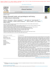 Thompson, A. S., Bondonno, N. P., Liu, Y. L., Qureshi, F., Kubzansky, L. D., Trudel-Fitzgerald, C., Boehm, J. K., Rimm, E. B. et Cassidy, A. (2026). Dietary flavonoid intake and psychological well-being – A bidirectional relationship. Clinical Nutrition, 58 . ISSN 0261-5614 DOI 10.1016/j.clnu.2026.106579