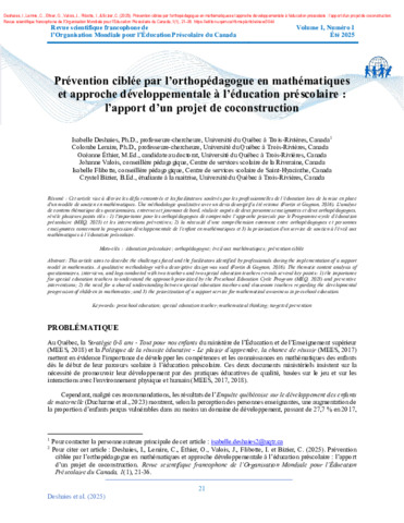Deshaies, I., Lemire, C., Éthier, O., Valois, J., Flibotte, I. et Bizier, C. (2025). Prévention ciblée par l’orthopédagogue en mathématiques et approche développementale à l’éducation préscolaire : l’apport d’un projet de coconstruction. Revue scientifique francophone de l'Organisation Mondiale pour l'Éducation Préscolaire du Canada, 1 (1). pp. 21-36.