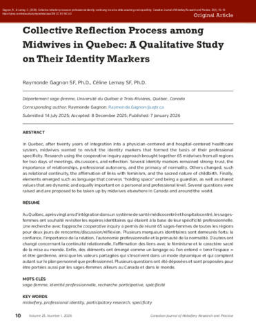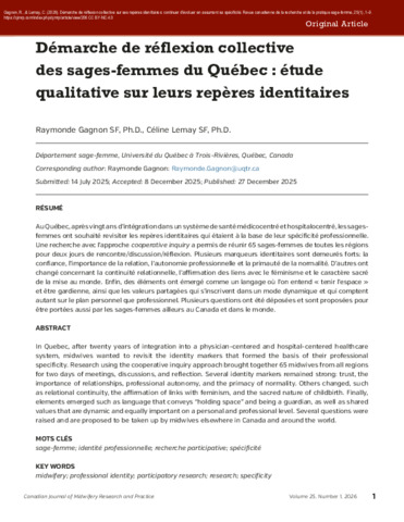 Gagnon, R. et Lemay, C. (2026). Démarche de réflexion collective sur ses repères identitaires: continuer d'évoluer en assumant sa spécificité = Collective reflection process on professionnal identity: continuing to evolve while assuming one's specificity. Revue canadienne de la recherche et de la pratique sage-femme / Canadian Journal of Midwifery Research and Practice, 25 (1). pp. 1-18. ISSN 2819-7798