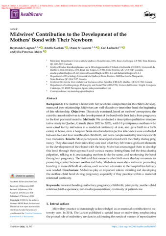 Gagnon, R., Garban, A., St-Laurent, D., Lacharité, C. et Perarnau Moles, J. (2026). Midwives’ contribution to the development of the mothers’ bond with their newborn. Healthcare, 14 (5). Article 597. ISSN 2227-9032 DOI 10.3390/healthcare14050597