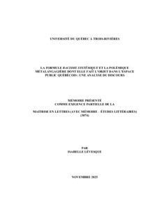 Lévesque, Isabelle (2025). La formule racisme systémique et la polémique métalangagière dont elle fait l’objet dans l’espace public québécois : une analyse du discours. Mémoire. Trois-Rivières, Université du Québec à Trois-Rivières, 158 p.