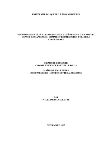 Brouillette, William (2025). Neuromancien de William Gibson et l’avènement d’un nouvel espace romanesque : comment représenter et lire le cyberespace. Mémoire. Trois-Rivières, Université du Québec à Trois-Rivières, 114 p.