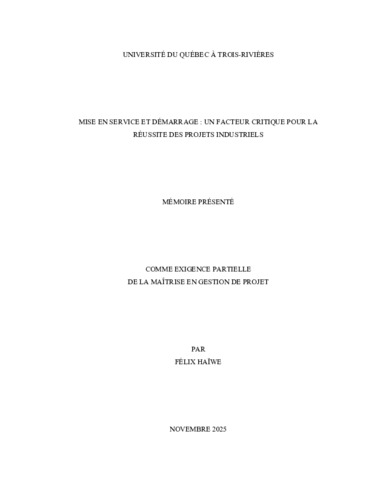 Haïwe, Félix (2025). Mise en service et démarrage : un facteur critique pour la réussite des projets industriels. Mémoire. Trois-Rivières, Université du Québec à Trois-Rivières, 179 p.