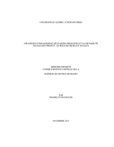 Ngueguim Yarro, Franklyn Anderson (2025). Stratégies d’engagement des parties prenantes et acceptabilité sociale des projets : le rôle des réseaux sociaux. Mémoire. Trois-Rivières, Université du Québec à Trois-Rivières, 159 p.