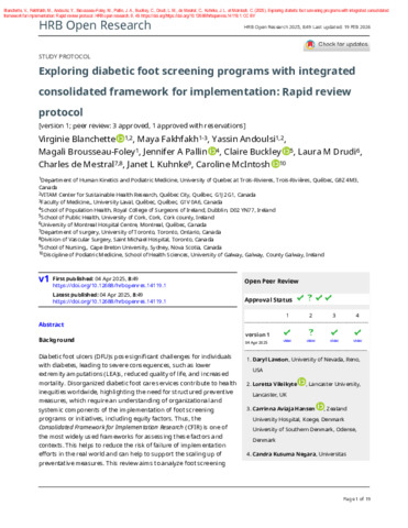 Blanchette, V., Fakhfakh, M., Andoulsi, Y., Brousseau-Foley, M., Pallin, J. A., Buckley, C., Drudi, L. M., de Mestral, C., Kuhnke, J. L. et McIntosh, C. (2025). Exploring diabetic foot screening programs with integrated consolidated framework for implementation: Rapid review protocol. HRB Open Research, 8 . p. 49. ISSN 2515-4826 DOI 10.12688/hrbopenres.14119.1