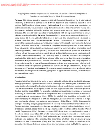 Lecours, A., Laribi, S., Laliberté, M. et Kiki, G. M. (2026). Mapping transversal competences for vocational education learners in response to transformations in the world of work: a scoping review. Education + Training . ISSN 0040-0912 1758-6127 DOI 10.1108/ET-08-2025-0678