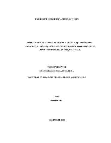 Khiat, Nihad (2025). Implication de la voie de signalisation TGFβ1/SMAD2 dans l’adaptation métabolique des cellules trophoblastiques en condition hyperglycémique in vitro. Thèse. Trois-Rivières, Université du Québec à Trois-Rivières, 155 p.