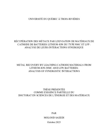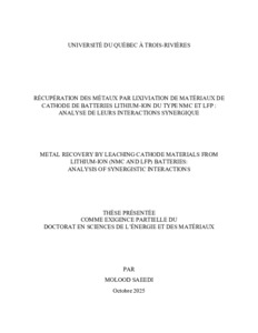 Saeedi, Molood (2025). Récupération des métaux par lixiviation de matériaux de cathode de batteries lithium-ion du type NMC et LFP : analyse de leurs interactions synergique = Metal recovery by leaching cathode materials from lithium-ion (NMC and LFP) batteries : analysis of synergistic interactions. Thèse. Trois-Rivières, Université du Québec à Trois-Rivières, 133 p.
