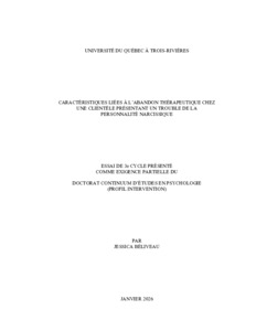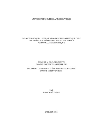 Béliveau, Jessica (2026). Caractéristiques liées à l’abandon thérapeutique chez une clientèle présentant un trouble de la personnalité narcissique. Essai. Trois-Rivières, Université du Québec à Trois-Rivières, 148 p.