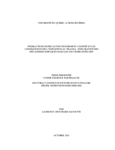 Chouinard-Gaouette, Laurence (2025). Interactions entre le fonctionnement cognitif et les conséquences de l’exposition au trauma : exploration des mécanismes impliqués dans les souvenirs intrusifs. Thèse. Trois-Rivières, Université du Québec à Trois-Rivières, 263 p.