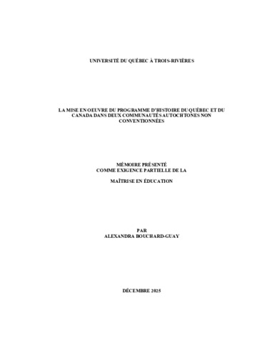 Bouchard-Guay, Alexandra (2025). La mise en oeuvre du programme d’histoire du Québec et du Canada dans deux communautés autochtones non conventionnées. Mémoire. Trois-Rivières, Université du Québec à Trois-Rivières, 123 p.