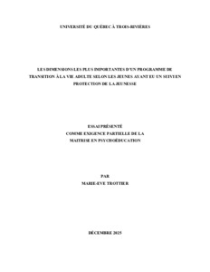 Trottier, Marie-Eve (2025). Les dimensions les plus importantes d’un programme de transition à la vie adulte selon les jeunes ayant eu un suivi en protection de la jeunesse. Essai. Trois-Rivières, Université du Québec à Trois-Rivières, 34 p.