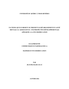 Guay, Jean-François (2026). Facteurs qui favorisent ou freinent le rétablissement en santé mentale à l’adolescence : une perspective développementale appliquée à la psychoéducation. Essai. Trois-Rivières, Université du Québec à Trois-Rivières, 38 p.