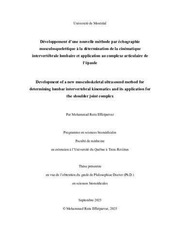 Effatparvar, Mohammad Reza (2025). Développement d’une nouvelle méthode par échographie musculosquelettique à la détermination de la cinématique intervertébrale lombaire et application au complexe articulaire de l’épaule = Development of a new musculoskeletal ultrasound method for determining lumbar intervertebral kinematics and its application for the shoulder joint complex. Thèse. Trois-Rivières ; Montréal, Université du Québec à Trois-Rivières ; Université de Montréal, 178 p.