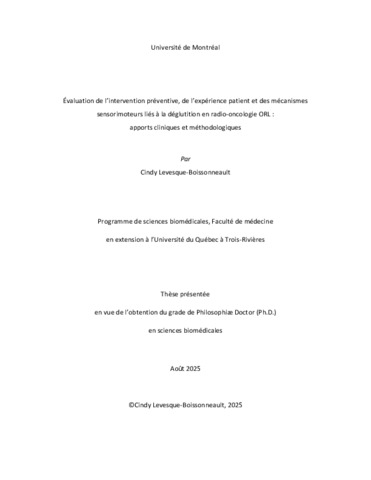 Levesque-Boissonneault, Cindy (2025). Évaluation de l’intervention préventive, de l’expérience patient et des mécanismes sensorimoteurs liés à la déglutition en radio-oncologie ORL : apports cliniques et méthodologiques. Thèse. Trois-Rivières ; Montréal, Université du Québec à Trois-Rivières ; Université de Montréal, 258 p.