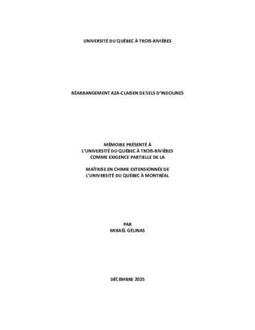 Gélinas, Mikaël (2025). Réarrangement aza-Claisen de sels d’indolines. Mémoire. Trois-Rivières ; Montréal, Université du Québec à Trois-Rivières ; Université du Québec à Montréal.