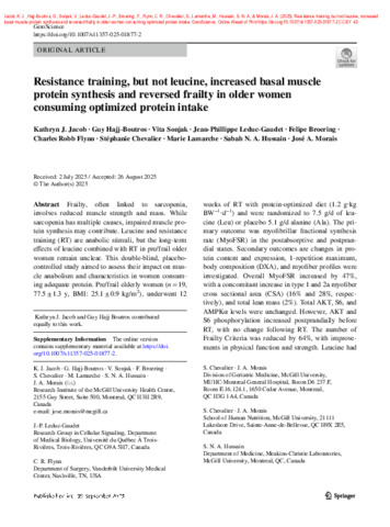 Jacob, K. J., Hajj-Boutros, G., Sonjak, V., Leduc-Gaudet, J.-P., Broering, F., Flynn, C. R., Chevalier, S., Lamarche, M., Hussain, S. N. A. et Morais, J. A. (2025). Resistance training, but not leucine, increased basal muscle protein synthesis and reversed frailty in older women consuming optimized protein intake. GeroScience . ISSN 2509-2715 2509-2723 DOI 10.1007/s11357-025-01877-2