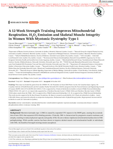 Marcangeli, V., Girard-Côté, L., Di Leo, V., Roussel, M.-P., Lawless, C., Charest, O., Argaw, A., Dulac, M., Hajj-Boutros, G., Morais, J. A., Vincent, A., Gouspillou, G., Leduc-Gaudet, J.-P. et Duchesne, E. (2025). A 12-week strength training improves mitochondrial respiration, H2O2 emission and skeletal muscle integrity in women with myotonic dystrophy type 1. Acta Physiologica, 241 (12). Article e70135. ISSN 1748-1708 1748-1716 DOI 10.1111/apha.70135