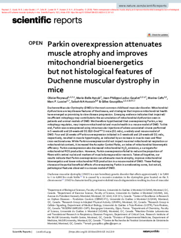 Reynaud, O., Ayoub, M.-B., Leduc-Gaudet, Jean-Philippe, Cefis, Marina, Lussier, Marc P., Hussain, Sabah N. A. et Gouspillou, Gilles (2026). Parkin overexpression attenuates muscle atrophy and improves mitochondrial bioenergetics but not histological features of Duchenne muscular dystrophy in mice. Scientific Reports, 16 (1). Article 4139. ISSN 2045-2322 DOI 10.1038/s41598-025-34223-9
