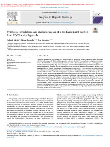 Malik, A., Barnabé, S. et Loranger, É. (2025). Synthesis, formulation, and characterization of a bio-based paint derived from TOCN and polypyrrole. Progress in Organic Coatings, 208 . Article 109511. ISSN 0300-9440 1873-331X DOI 10.1016/j.porgcoat.2025.109511