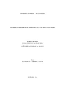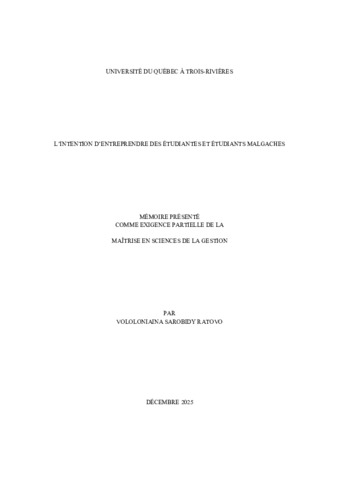 Ratovo, Vololoniaina Sarobidy (2025). L’intention d’entreprendre des étudiantes et étudiants malgaches. Mémoire. Trois-Rivières, Université du Québec à Trois-Rivières, 139 p.