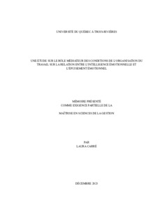 Carré, Laura (2025). Une étude sur le rôle médiateur des conditions de l’organisation du travail sur la relation entre l’intelligence émotionnelle et l’épuisement émotionnel. Mémoire. Trois-Rivières, Université du Québec à Trois-Rivières, 154 p.
