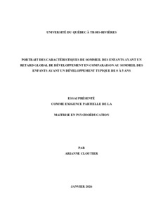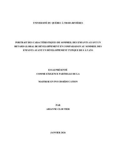 Cloutier, Arianne (2026). Portrait des caractéristiques de sommeil des enfants ayant un retard global de développement en comparaison au sommeil des enfants ayant un développement typique de 0 à 5 ans. Essai. Trois-Rivières, Université du Québec à Trois-Rivières, 35 p.