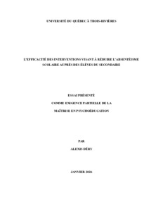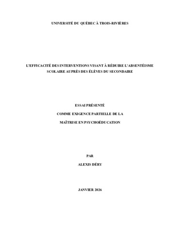Dery, Alexis (2026). L’efficacité des interventions visant à réduire l’absentéisme scolaire auprès des élèves du secondaire. Essai. Trois-Rivières, Université du Québec à Trois-Rivières, 43 p.