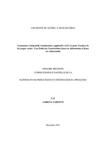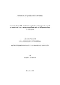 Taibouni, Sabrina (2025). Grammaire catégorielle combinatoire applicative (GCCA) pour l'analyse de la langue arabe : une étude des constructions Inna wa Akhawatoha et Kana wa Akhawatoha. Mémoire. Trois-Rivières, Université du Québec à Trois-Rivières, 99 p.