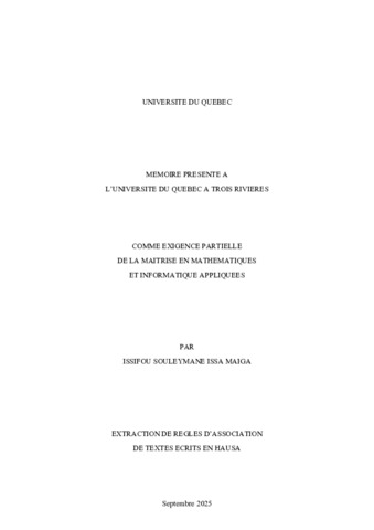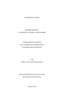 Souleymane Issa Maiga, Issifou (2025). Extraction de règles d’association de textes écrits en Hausa. Mémoire. Trois-Rivières, Université du Québec à Trois-Rivières, 76 p.