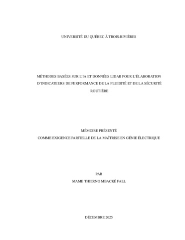 Fall, Mame Thierno Mbacké (2025). Méthodes basées sur l’IA et données LiDAR pour l’élaboration d’indicateurs de performance de la fluidité et de la sécurité routière. Mémoire. Trois-Rivières, Université du Québec à Trois-Rivières, 86 p.