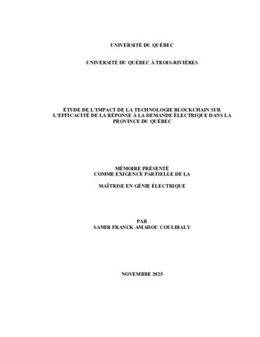 Coulibaly, Samir Franck Amadou (2025). Étude de l’impact de la technologie blockchain sur l’efficacité de la réponse à la demande électrique dans la province du Québec. Mémoire. Trois-Rivières, Université du Québec à Trois-Rivières, 139 p.