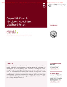 Arès, M. et Ostrum, R. B. (2026). Only a Sith deals in absolutes: A Jedi uses likelihood ratios. Journal of the American Society of Questioned Document Examiners, 27 (1). Article 3. ISSN 1524-7287 DOI 10.69525/jasqde.309